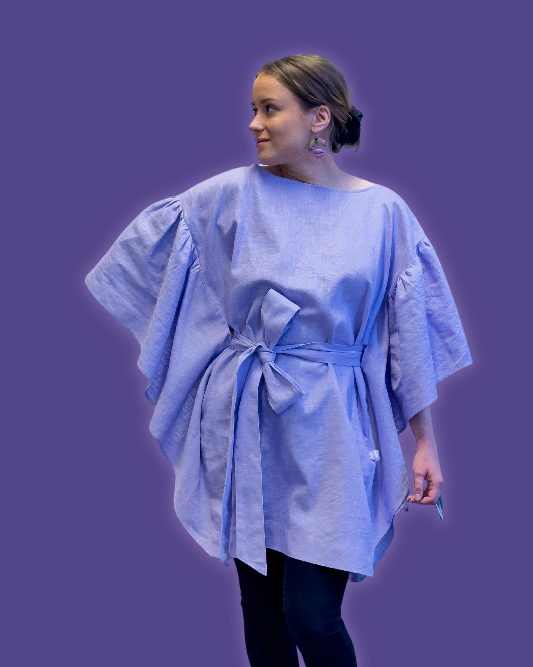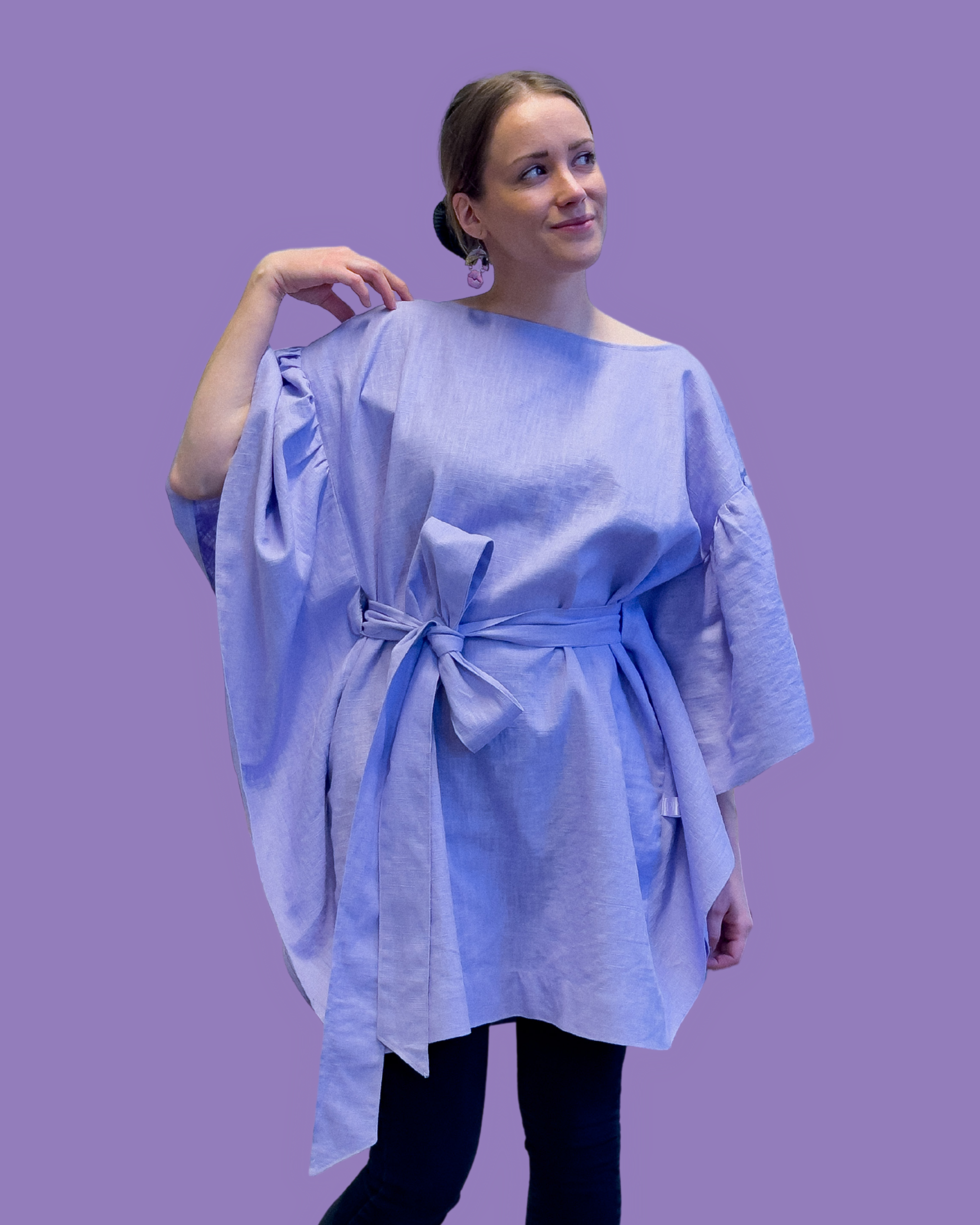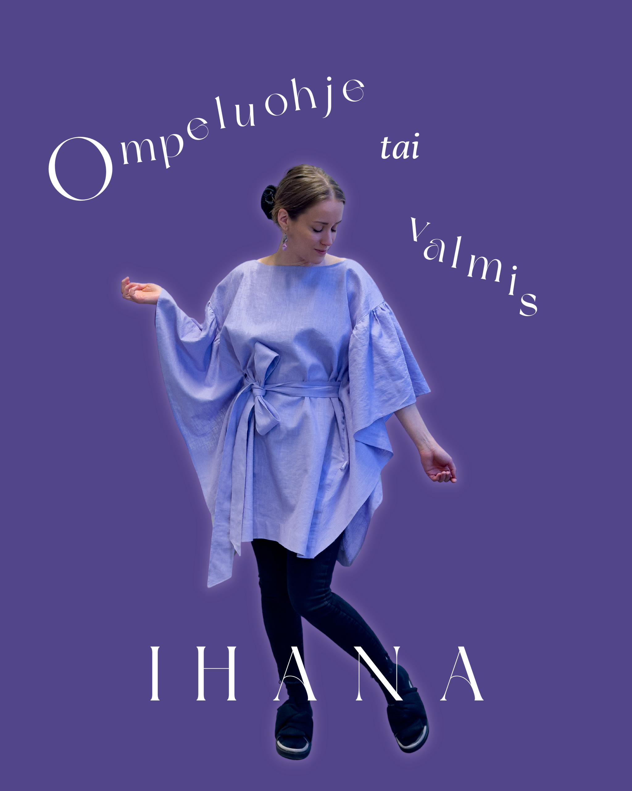 Kankaaksi sopii niin pellava, silkki, kuin satiinikin. Sinä valitset! Laskeutuvammasta kankaasta valmistat hieman maltillisemmilla frilla-hihoilla varustetun IHANAn, ja jäykemmästä kankaasta taas saat enemmän volyymia.