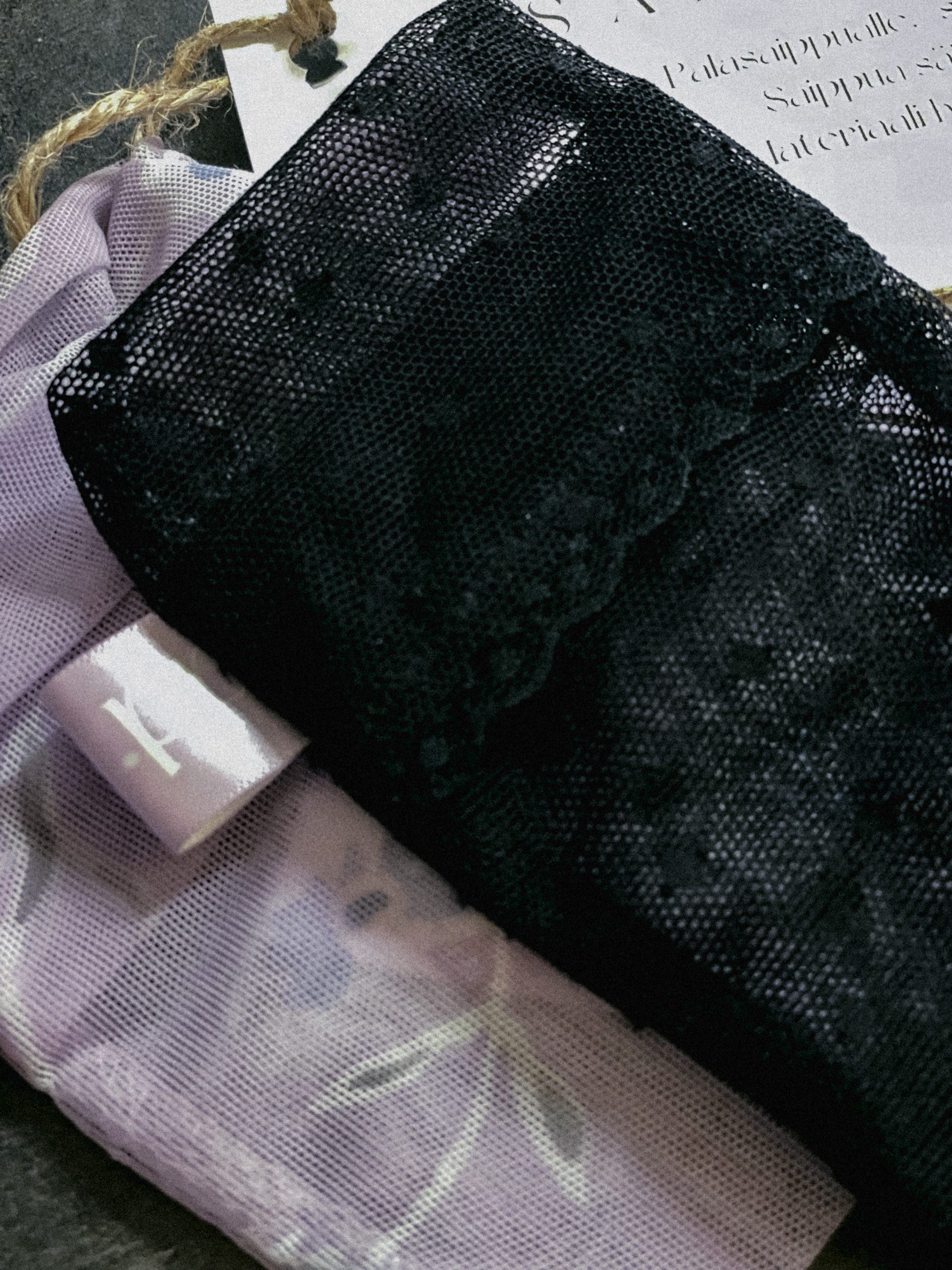 Valittavissa nyt musta pitsikangas (tuhmeliini) ja vaalean liila kukkakangas (söpöliini). Kierrätyskangas!